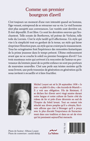 Michel Louyot révèle comment transmettre une riche expérience quand la fin de la vie approche doucement. Son récit de la destinée des trois corneilles noires va parcourir les évènements marquants des huit dernières décennies. Il donne du sens aux bouleversements apportés par les guerres et les révolutions. Ce texte délicat montre comment nos souvenirs peuvent continuer à vivre dans la mémoire de ceux qui nous succéderont. On pense à l'écriture sensible d'Anton Tchekhov où le territoire et la langue apparaissent comme un premier bourgeon d'avril. Né en 1938 à Pont-à-Mousson, fils d'un Résistant et Juste parmi les Nations, Michel Louyot après des études classiques a exercé des fonctions de coopération culturelle en Europe centrale, orientale et en Union Soviétique jusqu'en 1989, puis dans l'archipel nippon jusqu'en 1998. Depuis il se consacre à l'écriture. Sélectionné pour le Goncourt en 1988 pour Lorraine (Grasset), il obtient le Prix Erckmann-Chatrian en 2016 pour Un chouan Lorrain.