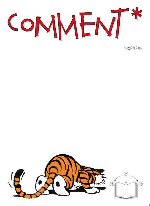 Comment est un dispositif d'exégèse de la bande dessinée par la bande dessinée. Ici, c'est un strip de Calvin & Hobbes qui est analysé, décliné, redéfini, extrapolé et décortiqué, à travers sa généalogie, sa postérité et ses significations possibles.