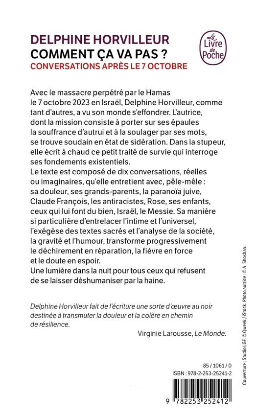 Avec le massacre perpétré par le Hamas le 7 octobre 2023 en Israël, l’autrice, comme tant d’autres, a vu son monde s’effondrer. Elle, dont la mission consiste à porter sur ses épaules la souffrance d’autrui et à la soulager par ses mots, se trouve soudain en état de sidération. Dans la stupeur, elle écrit à chaud ce petit traité de survie qui interroge ses fondements existentiels. Le texte est composé de dix conversations, réelles ou imaginaires, qu’elle entretient avec, pêle-mêle : sa douleur, ses grands-parents, la paranoïa juive, Claude François, les antiracistes, Rose, ses enfants, ceux qui lui font du bien, Israël, le Messie. Sa manière si particulière d’entrelacer l’intime et l’universel, l’exégèse des textes sacrés et l’analyse de la société, la gravité et l’humour, transforme progressivement le déchirement en réparation, la fièvre en force et le doute en espoir.