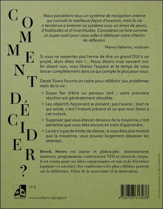 Si vous ne ressentez pas l’envie de dire un grand OUI à un projet, alors dites non ! Nous disons trop souvent oui. En disant non, vous libérez l’espace et le temps de vous lancer complètement dans ce qui compte le plus pour vous. Derek Sivers fournit un cadre pour réfléchir aux problèmes réels de la vie : soyez fier d’être un penseur lent ; votre première réaction est généralement obsolète. Les objectifs façonnent le présent, pas l’avenir ; tout ce qui existe, c’est l’instant présent et ce que vous faites à cet instant. Supposer que vous êtes en dessous de la moyenne, c’est admettre que vous êtes encore en train d’apprendre.