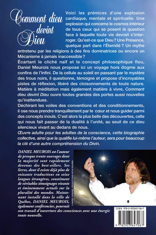 Qu’est-ce que Dieu ? Une Présence, un mythe, un Mécanisme à jamais inaccessible ? Écartant le cliché naïf et le concept philosophique flou, Daniel Meurois nous propose ici un voyage hors dogme aux confins de l’Infini. De la cellule au soleil en passant par le mystère des trous noirs, il questionne, témoigne et propose d’incroyables pistes de réflexion, libéré des cloisonnements de toute nature. Broché 15 x 23 - 170 pages