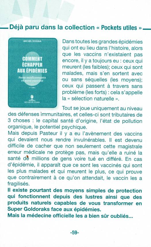 Dans toutes les grandes épidémies qui ont eu lieu dans l’histoire, alors que les vaccins n’existaient pas encore, il y a toujours eu : ceux qui meurent (les faibles); ceux qui sont malades, mais s’en sortent avec ou sans séquelles (les moyens); ceux qui passent à travers sans problème (les forts) : cela s’appelle la « sélection naturelle ». La différence tient uniquement au niveau des défenses immunitaires, et celles-ci sont tributaires de 3 choses : le capital santé d’origine, l’état de pollution organique, le potentiel psychique. Mais depuis Pasteur il y a eu l’avènement des vaccins qui devaient nous rendre invulnérables. Il est devenu difficile de cacher que non seulement cette magistrale erreur médicale ne protège pas, mais qu’elle a ruiné la santé de millions de gens voire tué en différé. En cas d’épidémie, il apparaît que ce sont les vaccinés qui sont les plus malades et qui meurent le plus, ce qui prouve que contrairement à ce qu’on attendait, le vaccin les a fragilisés. Il existe pourtant des moyens simples de protection qui fonctionnent depuis des lustres ainsi que des produits naturels capables de vous transformer en Super Goldoraks face aux épidémies. Mais la médecine officielle les a bien sûr oubliés...