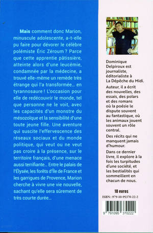 Marion est une adolescente très discrète qui rêve de devenir pâtissière. Mais une leucémie féroce la condamne. Lors d’une « permission de sortie » de l’hôpital, en désespoir de cause, elle s’injecte une étrange substance, fruit d’une récolte de restes de dinosaure au Pôle Sud…Petit à petit, la jeune fille toute menue se transforme en un terrifiant tyrannosaure. Les réseaux sociaux déroulent en boucle une visite du dinosaure au Muséum d’Histoire Naturelle, en plein Paris. Vrai animal ? Robot articulé ? Image virtuelle ? L’Elysée réunit une cellule de crise. Les journaux enquêtent. Les commentaires fusent. Marion visite une France vue par le petit bout de la lorgnette, avec ses misères et ses horreurs. L’aventure de Marion s’accélère. Va-t-on découvrir la vérité ? Le monstre, dont on découvre peu à peu l’humanité, va-t-il dévorer d’autres humains ? Un coup de théâtre lui permettra d’échapper à la voracité des médias. Narré avec poésie et humour, ce « road movie » dinosaurien fait apparaître des personnages tantôt attachants, tantôt burlesques, tantôt cruels, autour de cette « chimère » qui, se désespère autant qu’elle savoure cette animalité qui la submerge. Elle découvre enfin, au-delà de son univers enfantin, un monde sans pitié et brutal, dans le virtuel comme dans le réel.