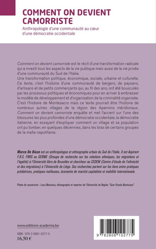 Comment on devient camorriste enquête et met l'accent sur l'une des blessures les plus profondes d'une démocratie occidentale, la démocratie italienne, en essayant d'expliquer comment un village et sa population ont pu tomber, en quelques décennies, dans les bras de certains groupes de la mafia napolitaine. Ce texte est le fruit de trois années de recherche et le titre n'est pas une provocation, il est ce qui contient la véritable histoire d'une communauté méridionale.