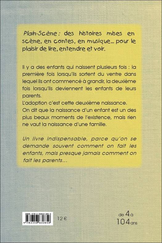 Dans la collection Plain-Scène : des histoires mises en scène, en contes, en musique... pour le plaisir de lire, entendre et voir. - « Il y a des enfants qui naissent plusieurs fois : la première fois lorsqu’ils sortent du ventre dans lequel ils ont commencé à grandir, la deuxième fois lorsqu’ils deviennent les enfants de leurs parents. L’adoption c’est cette deuxième naissance. On dit que la naissance d’un enfant est un des plus beaux moments de l’existence, mais rien ne vaut la naissance d’une famille. » - Un petit livre indispensable, parce qu’on se demande souvent comment on fait les enfants, mais trop rarement comment on fait les parents… - Au Pré du Plain, on aime les livres dont on sort un peu changés... pas forcément grandis, pas forcément savants, mais un peu différents ! - Le Pré du Plain s'efforce de mettre des livres dans toutes les poches. La plupart de nos ouvrages sont petits et peu onéreux. Ils s'envoient dans une simple enveloppe par abonnement ou clin d'œil de lecture-partage. Mais il nous a semblé que "Comment on fait certains parents..." devait entrer dans d'autres lieux et pouvoir se lire à plusieurs, dans les familles, les associations dédiées à l'adoption, les services de protection de l'enfance et de soutien aux grandes personnes en errance, partout où l'on ne se contente pas de s'interroger sur « comment on fait les enfants » mais où l'on se demande aussi « comment on fait les parents »... Pour cette raison, ce livre de 44 pages couleur existe en deux formats pour des lecteurs de 4 à 104 ans : - Le petit album « pour toutes les poches » est paru en mai 2022 - Le grand « pour lire à plusieurs » est sorti en juillet 2022