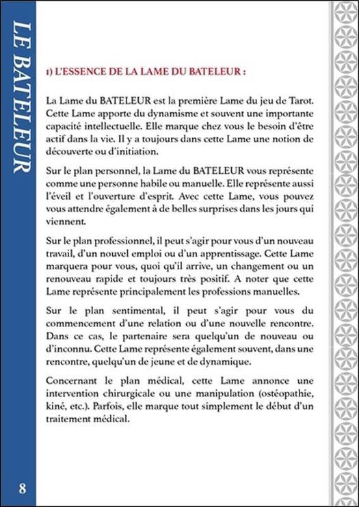 Ce petit livre est le complément idéal pour celui qui vient d'acquérir ou acquiert un tarot de Marseille. Il éclaire le lecteur sur le sens profond des arcanes majeurs et montre comment procéder à des tirages. Avec ce livre, il est très vite possible de faire des séances de divination et d'obtenir des messages clairs de votre tarot de Marseille. En complément, l'auteur s'est aussi penché sur la dimension talismanique des arcanes et vous découvrirez quand et comment préparer telle ou telle carte (selon le nombre, l'encens, la lettre hébraïque, la pierre, le jour de la semaine qui lui correspond...) et libérer ses propriétés selon vos besoins (protection, énergie, amour, mutation, diplôme, succès, acquisition, etc).