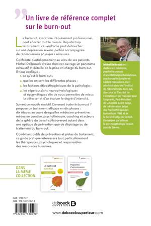 Confronté quotidiennement au vécu de ses patients, Michel Delbrouck dresse dans cet ouvrage un panorama exhaustif et détaillé de la prise en charge du burn-out. Une analyse fouillée des causes et répercussions neurophysiologiques et épigénétiques permet de mieux comprendre l’intensité et la durée de la symptomatologie des formes graves de burn-out. Certains patients à la symptomatologie légère, modérée ou sévère, peuvent vivre des phénomènes de dissociation. Ces mécanismes de défense destinés à éviter au patient un trop grand impact émotionnel peuvent devenir chroniques. Des phénomènes d’amnésie et/ou d’anesthésie psychique et/ou d’état dépressif majeur dominent parfois la clinique.
