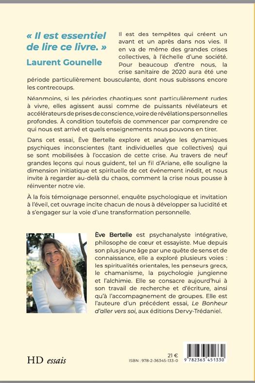 Il est des tempêtes qui créent un avant et un après dans nos vies. Il en va de même des grandes crises collectives, à l’échelle d’une société. Pour beaucoup d’entre nous, la crise sanitaire de 2020 aura été une période particulièrement bousculante, dont nous subissons encore les contrecoups. Néanmoins, si les périodes chaotiques sont particulièrement rudes à vivre, elles agissent aussi comme de puissants révélateurs et accélérateurs de prises de conscience, voire de révélations personnelles profondes. À condition toutefois de commencer par comprendre ce qui nous est arrivé et quels enseignements nous pouvons en tirer. Dans cet essai, Ève Bertelle explore et analyse les dynamiques psychiques inconscientes (tant individuelles que collectives) qui se sont mobilisées à l’occasion de cette crise. Au travers de neuf grandes leçons qui nous guident, tel un fil d’Ariane, elle souligne la dimension initiatique et spirituelle de cet événement inédit, et nous invite à regarder au-delà du chaos, comment la crise nous pousse à réinventer notre vie. À la fois témoignage personnel, enquête psychologique et invitation à l’éveil, cet ouvrage incite chacun de nous à développer sa lucidité et à s’engager sur la voie d’une transformation personnelle.