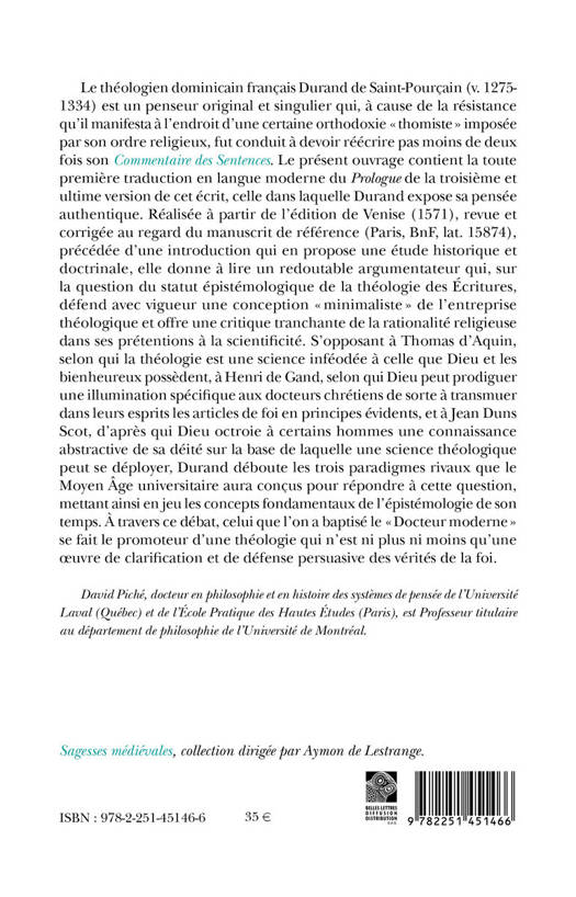 Le theologien dominicain francais Durand de Saint-Pourcain (v. 1275-1334) est un penseur original et singulier qui, a cause de la resistance qu'il manifesta a l'endroit d'une certaine orthodoxie thomiste imposee par son ordre religieux, fut conduit a devoir reecrire pas moins de deux fois son Commentaire des Sentences. Le present ouvrage contient la toute premiere traduction en langue moderne du Prologue de la troisieme et ultime version de cet ecrit, celle dans laquelle Durand expose sa pensee authentique. Realisee a partir de l'edition de Venise (1571), revue et corrigee au regard du manuscrit de reference (Paris, BnF, lat. 15874), precedee d'une introduction qui en propose une etude historique et doctrinale, elle donne a lire un redoutable argumentateur qui, sur la question du statut epistemologique de la theologie des Ecritures, defend avec vigueur une conception minimaliste de l'entreprise theologique et offre une critique tranchante de la rationalite religieuse dans ses pretentions a la scientificite. S'opposant a Thomas d'Aquin, selon qui la theologie est une science infeodee a celle que Dieu et les bienheureux possedent, a Henri de Gand, selon qui Dieu peut prodiguer une illumination specifique aux docteurs chretiens de sorte a transmuer dans leurs esprits les articles de foi en principes evidents, et a Jean Duns Scot, d'apres qui Dieu octroie a certains hommes une connaissance abstractive de sa deite sur la base de laquelle une science theologique peut se deployer, Durand deboute les trois paradigmes rivaux que le Moyen Age universitaire aura concus pour repondre a cette question, mettant ainsi en jeu les concepts fondamentaux de l'epistemologie de son temps. A travers ce debat, celui que l'on a baptise le Docteur moderne se fait le promoteur d'une theologie qui n'est ni plus ni moins qu'une oeuvre de clarification et de defense persuasive des verites de la foi.