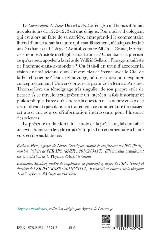 Le Commentaire du Traite Du ciel d'Aristote redige par Thomas d'Aquin aux alentours de 1272-1273 est une enigme. Pourquoi le theologien, qui est alors au faite de sa carriere, entreprend-il le commentaire litteral d'un texte sur la nature qui, manifestement, n'etait pas destine aux etudiants en theologie ? Avait-il, comme Albert le Grand, le projet de rendre Aristote intelligible aux Latins ? Cherchait-il a preciser ce qu'on peut appeler a la suite de Wilfrid Sellars l'image manifeste de l'homme-dans-le-monde ? Ou etait-il en train d'accorder la vision aristotelicienne d'un Univers clos et eternel avec le Ciel de la Foi chretienne ? Dans cet ouvrage, ou il est question d'explorer conceptuellement l'Univers corporel a partir de la lettre d'Aristote, Thomas livre un temoignage tres singulier de son propre style de pensee. A ce titre, le texte presente un interet a la fois historique et philosophique. Parce qu'il aborde la question de la nature et la place des mathematiques dans son traitement, ce commentaire thomasien est aussi une source d'information interessante pour l'histoire des sciences. La presente traduction fait le choix de la precision, laissant ainsi au texte thomasien le style caracteristique d'un commentaire a haute voix ecrit sous la dictee.