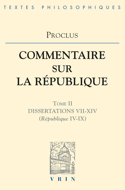 Le Commentaire de Proclus sur la Republique de Platon ne suit pas le texte platonicien phrase a phrase, comme les Commentaires sur l'Alcibiade ou sur le Timee, mais il offre une succession de dix-sept dissertations dans l'ordre des livrees de la Republique. Deux d'entres elles sont tres etendues: la sixieme qui est une defense d'Homere contre Platon et la seizieme sur le mythe d'Er, qui est adressee a Marinus, le disciple de Proclus, auteur de la Vita Procli. Cette derniere dissertation, de l'aveu meme de son auteur, rapporte et discute plusieurs fois les opinions de Porphyre. Proclus y a retenu et traite en detail deux sujets: l'entree de l'ame dans le corps et le crime horrible de manger ses propres enfants. La dix-septieme dissertation sur les critiques d'Aristote contre la Republique dans le deuxieme livre du Politique, est incomplete. Le traducteur a propose une division du texte et a donne d'abondantes notes qui forment une sorte de commentaire perpetuel.