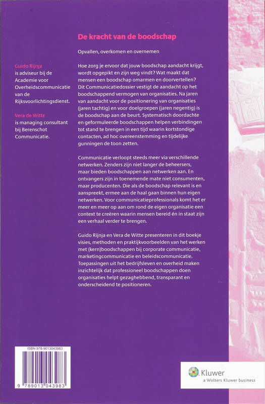 Een boekje met visies, methoden en praktijkvoorbeelden van het werken met (kern)boodschappen bij corporate communicatie, marketingcommunicatie en beleidscommunicatie. Toepassingen uit het bedrijfsleven en overheid maken inzichtelijk dat professioneel boodschappen doen organisaties helpt gezaghebbend, transparant en onderscheidend te positioneren.