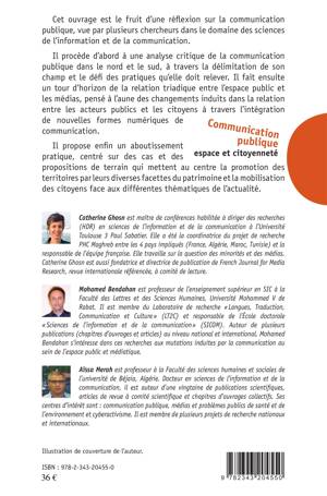 Cet ouvrage est le fruit d'une réflexion sur la communication publique : il procède d'abord à une analyse critique de la communication publique dans le nord et le sud, à travers la délimitation de son champ et le défi des pratiques qu'elle doit relever. Il fait ensuite un tour d'horizon de la relation triadique entre l'espace public et les médias, pensé à l'aune des changements induits dans la relation entre les acteurs publics et les citoyens à travers l'intégration de nouvelles formes numériques de communication. Il propose enfin un aboutissement pratique, centré sur des cas et des propositions de terrain qui mettent au centre la promotion des territoires par leurs diverses facettes du patrimoine et la mobilisation des citoyens face au différentes thématiques de l'actualité.