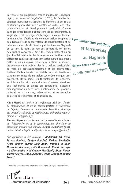 Partenaire du programme franco-maghrébin Langages, objets, territoires et hospitalités (LOTH), la Faculté de Béjaïa contribue, par ces travaux, à la réflexions sur les liens entre communication et développement territorial. L'ouvrage interroge la conception et la réalisation d'actions de communication couplées à des dispositifs de conservation, de réhabilitation et de mise en valeur de différents patrimoines du Maghreb en partant du point de vue des acteurs du terrain et des publics concernés.