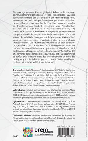 Cet ouvrage propose dans sa globalité d'observer le couplage communications/organisations et ses temporalités. Qu'elles soient transformées par le numérique, par la mondialisation ou encore par les politiques publiques voire par une combinaison de ces différents éléments, les temporalités organisationnelles en transformations tendent davantage vers l'accélération que vers une gestion humainement raisonnable du temps de travail et au travail.