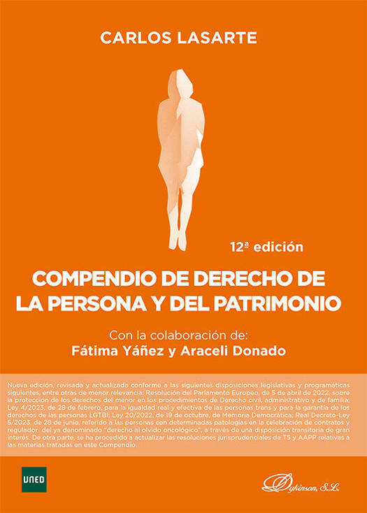Este Compendio de Derecho de la persona y del patrimonio ha sido redactado con las miras puestas en suministrar unos buenos, aunque sintéticos, conocimientos de las materias en él expuestas, con objeto de que la reducción del número de créditos en buena parte de los actuales Grados universitarios no signifique preterir la arquitectura conceptual propia del sector del Derecho privado considerado. Esta nueva edición ha sido actualizada de manera rigurosa atendiendo a las disposiciones legislativas y programáticas siguientes que constan también en la cubierta de la obra : Resolución del Parlamento Europeo, de 5 de abril de 2022, sobre la protección de los derechos del menor en los procedimientos de Derecho civil, administrativo y de familia; Ley 4/2023, de 28 de febrero, para la igualdad real y efectiva de las personas trans y para la garantía de los derechos de las personas LGTBI; Ley 20/2022, de 19 de octubre, de Memoria Democrática; Real Decreto-Ley 5/2023, de 28 de junio, referido a las personas con determinadas patologías en la celebración de contratos y regulador del ya denominado ôderecho al olvido onco