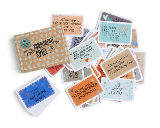 Het Complimentenspel bestaat nu uit: - 80 complimentenkaarten; - 15 vragenkaarten; - 10 kaarten met spelvormen.