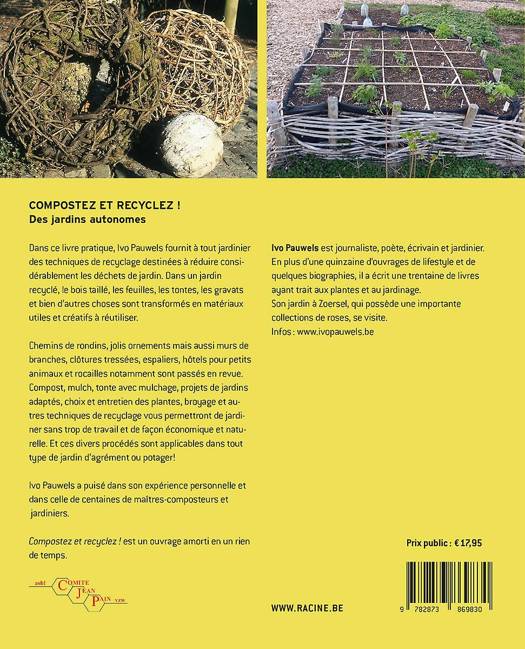 Dans ce livre pratique, Ivo Pauwels fournit à tout jardinier des techniques de recyclage destinées à réduire considérablement les déchets de jardin. Dans un jardin recyclé, le bois taillé, les feuilles, les tontes, les gravats et bien d'autres choses sont transformés en matériaux utiles et créatifs à réutiliser. Chemins de rondins, jolis ornements mais aussi murs de branches, clôtures tressées, espaliers, hôtels pour petits animaux et rocailles notamment sont passés en revue. Compost, mulch, tonte avec mulchage, projets de jardins adaptés, choix et entretien des plantes, broyage et autres techniques de recyclage vous permettront de jardiner sans trop de travail et de façon économique et naturelle. Et ces divers procédés sont applicables dans tout type de jardin d'agrément ou potager ! Ivo Pauwels a puisé dans son expérience personnelle et dans celle de centaines de maîtres-composteurs et jardiniers. Compostez et recyclez ! est un ouvrage amorti en un rien de temps.