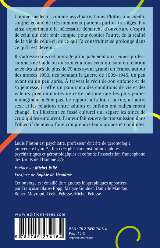 Principalement destiné aux jeunes professionnels de l'aide ou du soin et à tous ceux qui sont en relation avec des aînés ayant grandi en France autour des années 1950, nés pendant la guerre de 1939-1945, un peu avant ou un peu après, cet ouvrage offre un panorama des conditions de vie de cette période, inimaginables à l'heure actuelle. Le fossé culturel qui sépare ces aînés de ceux qui les entourent ne fait pas l'objet d'un enseignement qui permettrait de mieux comprendre nombre de leurs propos et conduites. Louis Ploton fait œuvre de transmission en racontant son enfance et sa jeunesse et plus généralement le monde dans lequel ont vécu les personnes âgées d'aujourd'hui.