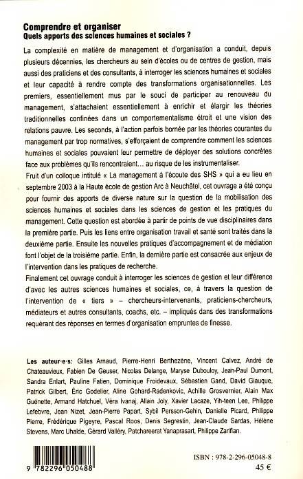 Cet ouvrage s'intéresse à la question de la mobilisation des sciences humaines et sociales dans les sciences de gestion et les pratiques du management. Les liens entre organisation, travail et santé sont également étudiés, ainsi que les nouvelles pratiques d'accompagnement et de médiation, et enfin les enjeux de l'intervention dans les pratiques de recherche.