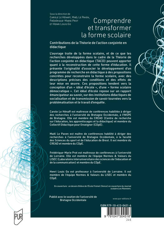 L’ouvrage traite de la forme scolaire, et de ce que les recherches développées dans le cadre de la Théorie de l’action conjointe en didactique (TACD) peuvent apporter quant à la reconstruction de cette forme d’éducation. Il présente l’originalité d’associer le développement d’un programme de recherche en didactique à des propositions concrètes pour reconstruire la forme scolaire, avec des descriptions précises des conditions et des effets de leur mise en oeuvre. Ces propositions tendent vers la conception d’un « idéal d’école », d’une « forme scolaire démocratique ». Cet idéal d’école repose sur un rapport émancipateur au savoir, sur des institutions didactiques de socialisation et de transmission de savoir tournées vers la problématisation et le travail d’enquête.