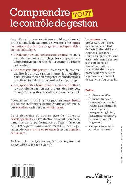 Les spécificités fonctionnelles ou sectorielles : le contrôle de gestion des projets, des services, le contrôle de gestion sociale et environnemental.Abondamment illustré, le livre propose de nombreux cas pour se confronter aux problématiques de terrain, des encadrés variés et des témoignages. Cette deuxième édition intègre de nouveaux développements sur l’évaluation des coûts complets, l’analyse de la performance et l’identification de KPI (key performance indicators). Elle inclut également des cas enrichis ou renouvelés, et des données actualisées.
