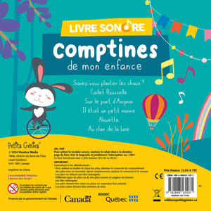 Un livre joyeusement illustré avec les paroles de chansons. L'enfant appuie sur le bouton qui fait entendre l'enregistrement de six comptines d'enfance. Vous aimerez: Chaque page présente une douce illustration et les paroles accompagnent l'enfant dans son apprentissages des comptines! Les puces sonores musicales permettent d'écouter et de chanter en choeur. Inclus des comptines populaires: Savez-vous planter les choux, Cadet Rousselle et plusieurs autres!