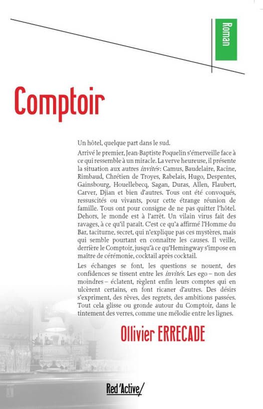 Les personnages sont convoqués dans un hôtel, sans savoir pourquoi. Ils ne peuvent pas le quitter ni pratiquer leur métier, qu’ils ont en commun. Ainsi, ils se réunissent au comptoir. Ils parlent, beaucoup. Molière, Hemingway, Sagan, Baudelaire, Céline, Sand, Nothomb, Camus, Houellebecq, Racine, Despentes, Hugo, Rimbaud, et d’autres, règlent des comptes à travers leurs siècles et leurs visions du monde et de l’Homme. Que font-ils là ? Comment ces drôles d’invités vivent-ils cet enfermement de luxe ? À quoi ressemble ce monde, dehors ? Les relations hommes-femmes, les secrets, les failles de chacun, leurs états de santé, à quoi aurait ressemblé leur vie s’ils ne l’avaient pas perdue à écrire ? À quoi ressemblerait leur monde rêvé, à chacun ?