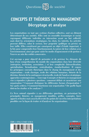 Cet ouvrage a pour objectif de présenter et de préciser les éléments de base d'une compréhension du monde des organisations dans leur diversité (entreprise, institution, association...) et leur complexité (hiérarchisation, spécialisation, formalisation, centralisation, standardisation). Il expose les principaux courants théoriques dans le champ du management et des organisations : école classique, école des relations humaines, théorie de la décision, théorie de la contingence structurelle, école de l'analyse stratégique, approches contemporaines... L'ouvrage Concepts et théories en management vise à répondre à plusieurs questions : comment définir et caractériser une organisation ? Comment distinguer les différentes formes d'organisation ? Sur quels critères ? Comment fonctionne une organisation ? De quelle façon doit-on les étudier et les analyser ?