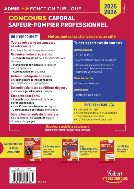 Tout pour réussir le concours de caporal sapeur-pompier professionnel 2025-2026 !Ce livre s'adresse aux candidats du concours externe et du concours externe réservé aux SPV (sapeurs-pompiers volontaires) de caporal sapeur-pompier professionnel 2025-2026.