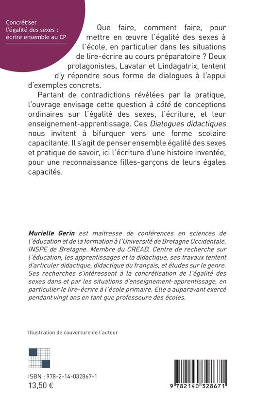 Que faire, comment faire, pour mettre en oeuvre l'égalité des sexes à l'école, en particulier dans les situations de lire-écrire au cours préparatoire ? Deux protagonistes, Lavatar et Lindagatrix, tentent d'y répondre sous forme de dialogues à l'appui d'exemples concrets. Partant de contradictions révélées par la pratique, l'ouvrage envisage cette question à côté de conceptions ordinaires sur l'égalité des sexes, l'écriture, et leur enseignement-apprentissage. Ces Dialogues didactiques nous invitent à bifurquer vers une forme scolaire capacitante. Il s'agit de penser ensemble égalité des sexes et pratique de savoir, ici l'écriture d'une histoire inventée, pour une reconnaissance filles-garçons de leurs égales capacités.