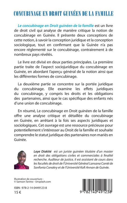 Ce livre de droit civil analyse de manière critique la notion de concubinage en Guinée. Il présente deux conceptions de cette notion, à savoir la conception juridique et la conception sociologique, tout en confirmant que la Guinée n'a pas encore réglementé sur le concubinage, contrairement à de nombreux pays révélés. Le livre est divisé en deux parties principales. La première partie traite de l'aspect sociojuridique du concubinage en Guinée, en abordant l'aperçu général de la notion ainsi que les différentes formes de concubinage. La deuxième partie se concentre sur la portée juridique du concubinage. Elle examine les effets juridiques du concubinage, y compris les Droits et les obligations des partenaires, ainsi que le cas spécifique des enfants nés d'une union de concubinage.