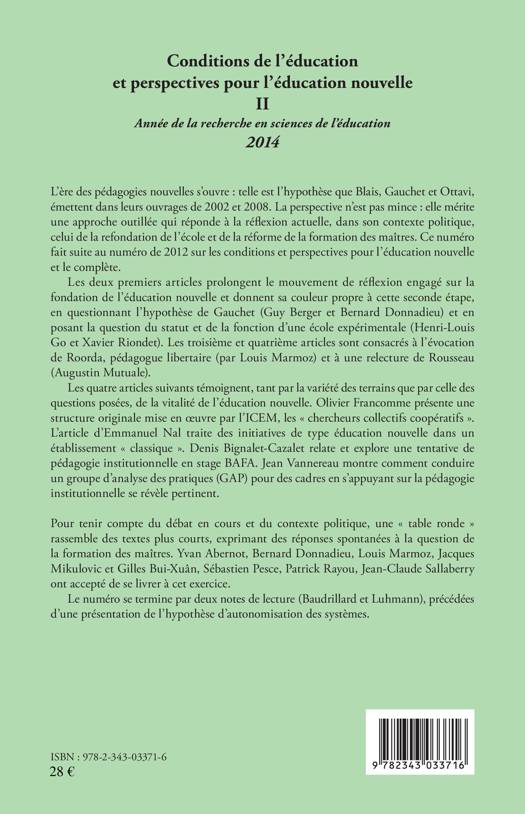 L'ère des pédagogies nouvelles s'ouvre : telle est l'hypothèse que Blais, Gauchet et Ottavi, émettent dans leurs ouvrages de 2002 et 2008. La perspective n'est pas mince : elle mérite une approche outillée qui réponde à la réflexion actuelle, dans son contexte politique, celui de la refondation de l'école et de la réforme de la formation des maîtres. Ce numéro fait suite au numéro de 2012 sur les conditions et perspectives pour l'éducation nouvelle et le complète.