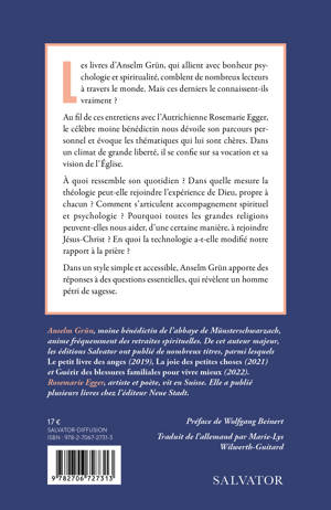 Ce moine bénédictin allemand est connu et traduit dans le monde entier pour ses livres qui mêlent psychologie et spiritualité. Pour la première fois, il revient sur son parcours personnel et sur les grandes thématiques qui lui sont chères, dans cet entretien avec l'écrivain Rosemarie Egger. Dans un climat de grande liberté, il partage ce qui lui tient le plus à cÅur. Qu'est-ce que sa vie et sa vocation comme moine bénédictin ? A quoi ressemble son quotidien ? Comment voit-il le rapport entre l'expérience de Dieu et la théologie? Et entre la pastorale et de la psychologie, la foi et la dimension de la psyché ? Que dire de la révélation dans les grandes religions et traditions ? Quelles personnalités, à l'instar du psychanalyste C. G. Jung, l'ont marqué dans sa réflexion ? Comment se voit-il être en chemin vers Dieu ? Qu'est-ce qui lui semble le plus important alors qu'il entre dans l'âge de la vieillesse ?