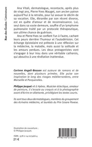 Ana Vitali, dermatologue, recontacte, après plus de vingt ans, Pierre-Yves Mauget, son ancien patron aujourd’hui à la retraite, pour lui avouer le déclin de sa vocation. Elle, ébranlée par son récent divorce, est en quête d’amour et de reconnaissance. Lui, seul dans sa vaste demeure, souffre d’un lymphome pulmonaire traité par un protocole thérapeutique, son ultime chance de guérison. Ana et Pierre-Yves se confient l’un à l’autre, cachant leurs peurs derrière l’humour et l’autodérision. Cet échange épistolaire est prétexte à une réflexion sur la médecine, la maladie, mais aussi la solitude et les amours perdues. Les deux protagonistes vont s’engager à leur insu dans une véritable catharsis, qui aboutira à une révélation inattendue.