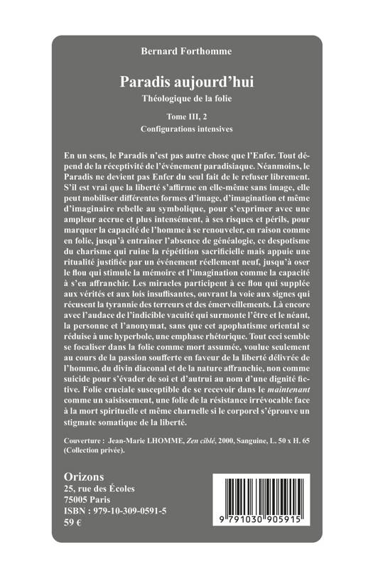 En un sens, le Paradis n'est pas autre chose que l'Enfer. Tout dépend de la réceptivité de l'événement paradisiaque. Néanmoins, le Paradis ne devient pas Enfer du seul fait de le refuser librement. S'il est vrai que la liberté s'affirme en elle-même sans image, elle peut mobiliser différentes formes d'image, d'imagination et même d'imaginaire rebelle au symbolique, pour s'exprimer avec une ampleur accrue et plus intensément, à ses risques et périls, pour marquer la capacité de l'homme à se renouveler, en raison comme en folie, jusqu'à entraîner l'absence de généalogie, ce despotisme du charisme qui ruine la répétition sacrificielle mais appuie une ritualité justifiée par un événement réellement neuf, jusqu'à oser le flou qui stimule la mémoire et l'imagination comme la capacité à s'en affranchir. Les miracles participent à ce flou qui supplée aux vérités et aux lois insuffisantes, ouvrant la voie aux signes qui récusent la tyrannie des terreurs et des émerveillements. Là encore avec l'audace de l'indicible vacuité qui surmonte l'être et le néant, la personne et l'anonymat, sans que cet apophatisme oriental se réduise à une hyperbole, une emphase rhétorique. Tout ceci semble se focaliser dans la folie comme mort assumée, voulue seulement au cours de la passion soufferte en faveur de la liberté délivrée de l'homme, du divin diaconal et de la nature affranchie, non comme suicide pour s'évader de soi et d'autrui au nom d'une dignité fictive. Folie cruciale susceptible de se recevoir dans le maintenant comme un saisissement, une folie de la résistance irrévocable face à la mort spirituelle et même charnelle si le corporel s'éprouve un stigmate somatique de la liberté.