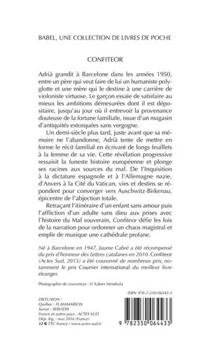 Avant que la lucidité ne le quitte à jamais, un homme écrit à la femme de sa vie, dans le chaos absolu d'une mémoire vacillante, de longs feuillets recto/verso. D'un côté : l'itinéraire d'un enfant sans amour et l'affliction d'un adulte sans dieu ; de l'autre : l'histoire du Mal souverain. «Confiteor» (en latin : «je confesse») est une véritable cathédrale profane.