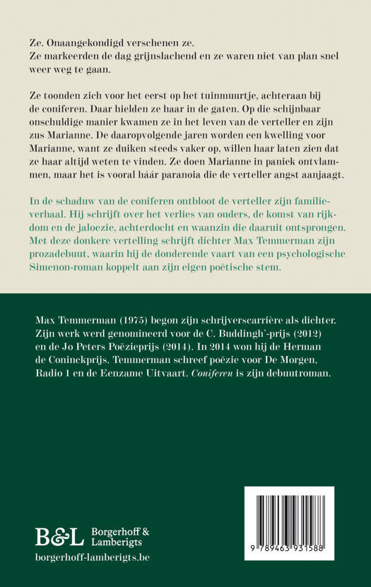 In de schaduw van de coniferen ontbloot de verteller zijn familieverhaal, over het verlies van ouders, de komst van rijkdom, over de jaloezie, achterdocht en waanzin die daaruit ontsprongen. Met deze donkere vertelling schrijft dichter Max Temmerman (°1975) zijn prozadebuut, waarin hij de donderende vaart van een Simenon-roman koppelt aan zijn eigen poëtische stem.