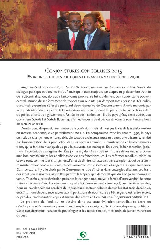 Ces textes entendent décrire et analyser les tendances actuelles de la vie politique, économique et sociale en RDC. 2015, année du questionnement et de la confusion, mais tel n'est pas le cas en matière économique et, partiellement, sociale : en comparaison avec les années 1990, le pays connaît un taux de croissance soutenu depuis une décennie (augmentation de la production minière, construction et communication qui font diminuer la pauvreté des métropoles, bancarisation et régularité des salaires). Le problème de fond est l'évolution contradictoire entre un développement économique prometteur et une détérioration du paysage politique.