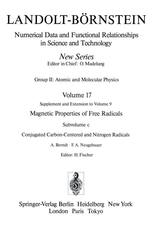Volume II/17 c is the third part of a supplement to the pre- vious compilations II/1 and II/9 a-d2 on magnetic properties of free radicals published in 1965 and 1977-1980, which covered the literature up to 1975. Due to the still very rapid development of the field and the inclusion of new sub- jects, the supplement covering the period 1975-85 had to be split into subvolumes, which will appear in fast succession. Togetherwith the ealier volumes, II/17 offers an up-to-date and comprehensive surveyand a collection of data on impor- tant chemical intermediates.