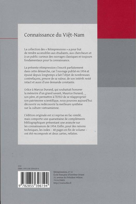 Grâce à Marcus Durand, qui souhaitait honorer la mémoire d’un grand savant, Maurice Durand, son père, et permettre à l’EFEO de se réapproprier son patrimoine scientifique, nous pouvons aujourd’hui découvrir ou redécouvrir la meilleure synthèse sur la culture vietnamienne.