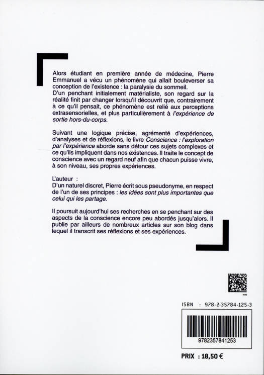 Alors étudiant en première année de médecine, Pierre Emmanuel vit un phénomène qui va bouleverser sa conception de l'existence : la paralysie du sommeil. D’un penchant initialement matérialiste, il va finir par changer de regard sur la réalité en découvrant par son expérience que, contrairement à ce qu'il pensait, ce phénomène est relié aux perceptions extrasensorielles et à ce qui est connu actuellement sous le nom de médiumnité et, surtout, à l'expérience de sortie hors-du-corps. Suivant une logique précise, agrémenté d'expériences, d'analyses et de réflexions, le livre "Conscience : l'exploration par l'expérience" aborde sans détour ces sujets complexes et ce qu'ils impliquent dans nos existences avec un œil nouveau, dans l’optique que chacun puisse vivre soi-même ses propres expériences.