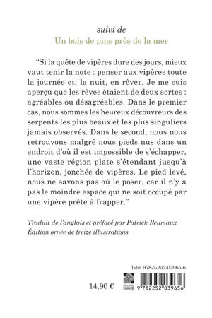 English summary: Poetic and sensitive, this field guide to snakes provides readers with a unique window onto the spaces, habits, and natural lives of these most misjudged and maligned of our reptilian neighbors. French description: "La source vive du genie de Hudson, etait un feu interieur d'emotions, et d'amour, et de colere, et de pitie, qui percait sous le masque de l'observateur et etincelait dans ses yeux en reponse a la beaute, celle de la nature ou d'une femme, des oiseaux, ou des plantes, ou des arbres, ou des cieux, ou de leur mere la terre". Edward Garnett " J'ai pense qu'il ne serait pas inutile de donner a mes lecteurs quelques conseils ou quelques tuyaux sur la chasse aux viperes, sachant qu'ils sont nombreux a vouloir faire connaissance avec ce rare et insaisissable reptile. Ils desirent le connaitre - a une distance respectable - a l'etat de nature, dans son habitat, l'ont cherche, mais n'ont rien trouve. Tres frequemment - une ou deux fois par semaine environ, en ete - quelqu'un me demande d'etre un guide en la matiere. ()Ce que nous cherchons c'est la vipere objet de culte, qui a genere la pierre sacree des Druides, et cette vipere n'habite pas dans un bocal d'alcool, a l'ombre d'un musee ou la temperature est egale. C'est une amoureuse du soleil que l'on doit chercher, apres son sommeil hivernal, dans les endroits secs, incultes, surtout dans les garrigues, les coteaux pierreux, les landes et les prairies couvertes d'ajoncs. Avec un peu d'entrainement, le chasseur de viperes, reconnait tout de suite un paysage viperin. Il n'est d'ailleurs pas necessaire d'errer au hasard a la recherche d'un terrain de chasse convenable, car tous les endroits hantes par les viperes sont bien connus des gens du voisinage, qui ne sont que trop heureux de donner les informations necessaires. Il n'y a pas de defenseurs des viperes a la campagne, et, autant que je le sache, il y a eu qu'une seule personne en Angleterre pour proteger cette belle et inoffensive creature, la couleuvre a collier. Peut-on comprendre cette passion ? " Extrait de Conseils aux chasseurs de viperes.