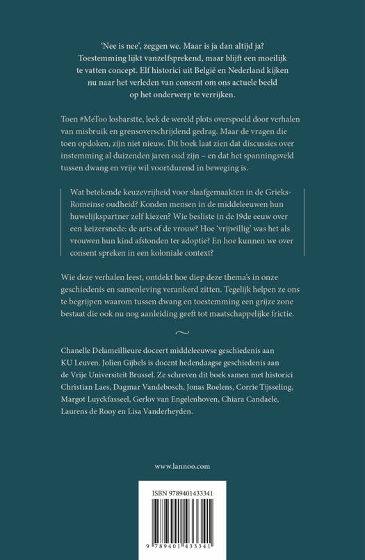 'Nee is nee', zeggen we. Maar is ja dan altijd ja? Toestemming lijkt vanzelfsprekend, maar blijft een moeilijk te vatten concept. Elf historici uit België en Nederland kijken nu naar het verleden van consent om ons actuele beeld op het onderwerp te verrijken. Toen #MeToo losbarstte, leek de wereld plots overspoeld door verhalen van misbruik en grensoverschrijdend gedrag. Maar de vragen die toen opdoken, zijn niet nieuw. Dit boek laat zien dat discussies over instemming al duizenden jaren oud zijn - en dat het spanningsveld tussen dwang en vrije wil voortdurend in beweging is. Wat betekende keuzevrijheid voor slaafgemaakten in de Grieks-Romeinse oudheid? Konden mensen in de middeleeuwen hun huwelijkspartner zelf kiezen? Wie besliste in de 19de eeuw over een keizersnede: de arts of de vrouw? Hoe 'vrijwillig' was het als vrouwen hun kind afstonden ter adoptie? En hoe kunnen we over consent spreken in een koloniale context? Wie deze verhalen leest, ontdekt hoe diep deze thema's in onze geschiedenis en samenleving verankerd zitten. Tegelijk helpen ze ons te begrijpen waarom tussen dwang en toestemming een grijze zone bestaat die ook nu nog aanleiding geeft tot maatschappelijke frictie. Chanelle Delameillieure doceert middeleeuwse geschiedenis aan KU Leuven. Jolien Gijbels is docent hedendaagse geschiedenis aan de Vrije Universiteit Brussel. Ze schreven dit boek samen met historici Christian Laes, Dagmar Vandebosch, Jonas Roelens, Corrie Tijsseling, Margot Luyckfasseel, Gerlov van Engelenhoven, Chiara Candaele, Laurens de Rooy en Lisa Vanderheyden.