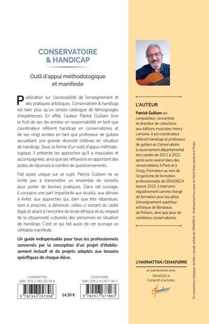 Publication sur l'accessibilité de l'enseignement et des pratiques artistiques, Conservatoire & handicap est bien plus qu'un simple catalogue de témoignages d'expériences. En effet, l'auteur Patrick Guillem livre le fruit de ses dix années en responsabilité en tant que coordinateur référent handicap en conservatoires et de ses vingt années en tant que professeur de guitare accueillant une grande diversité d'élèves en situationde handicap. Sous la forme d'un outil d'appui méthodologique, il présente les approches qu'il a impulsées et accompagnées, ainsi que ses réflexions en apportant des pistes de réponses à nombre de questionnements. Un guide indispensable pour tous les professionnels concernés par la conception d'un projet d'établissement inclusif et de projets adaptés aux besoins spécifiques de chaque élève.