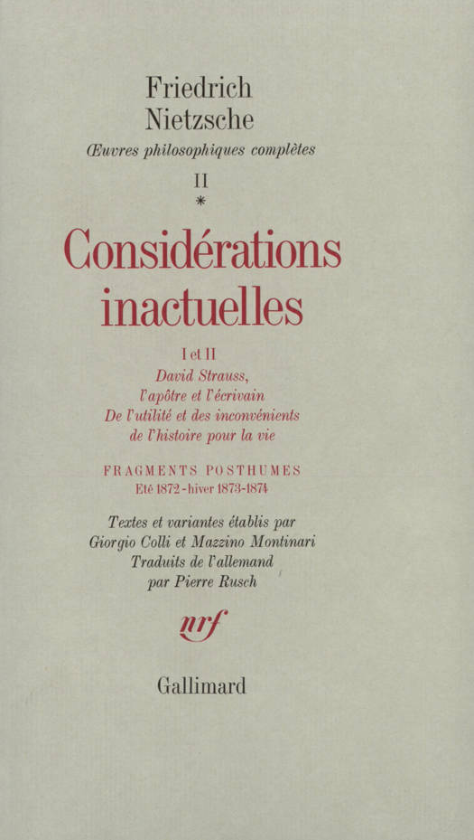 Nietzsche prévoyait d'abord d'écrire treize "considérations inactuelles", c'est-à-dire de petits essais dénonçant chacun, d'un point de vue "intempestif", tel aspect de la culture prétendument "contemporaine". Quatre seulement de ces Considérations furent publiées, et la première s'en prend à David Strauss en qui Nietzsche voyait le modèle du " philistin" incapable de répondre aux bouleversements de l'époque autrement qu'en prônant une sorte de résignation nostalgique. La deuxième Considération, plus résolument philosophique, dénonce l'historicisme dominant, "l'histoire n'est pas au service de la connaissance pure, mais de la vie". L'excès de science historique paralyse la volonté et l'action libres, surtout lorsqu'il s'agit d'histoire " monumentale" et "antiquaire" ; mais Nietzsche fait aussi droit à l'histoire "critique", se refusant - au contraire de ce que, par la suite, on a voulu lui faire dire - à considérer que l'histoire n'avait pas sa place parmi les expressions culturelles des besoins de la vie. Cette deuxième Considération est à l'origine des réflexions qu'un Max Weber et un Ernst Troeltsch consacreront au statut et à la nature de la science historique.