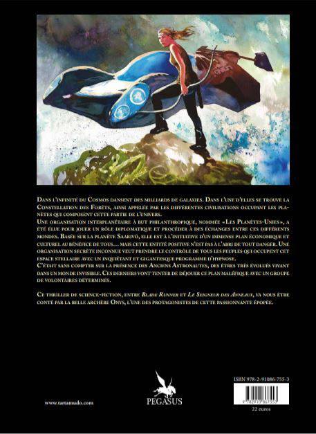 Dans l'immensité de l'univers se trouve la Constellation des Forêts , au sein de laquelle des civilisations s'organisent autour de la congrégation des Astres Unis. Depuis la révélation de l'existence des Anciens Astronautes, une grande agitation s'est répandue parmi les habitants de la planète La Plaine qui en fait partie. Ces derniers sont des sages mythiques, qui viennent de zones lointaines perdues dans le cosmos... L'une des technologies essentielles de ces êtres exceptionnels a été dérobée. Par qui, nul ne le sait au moment où commence cette quête. Un réseau inconnu, situé dans une galaxie voisine, semble vouloir utiliser ce savoir remarquable pour manipuler à distance l'esprit des peuples qui demeurent dans les communautés qui composent cette congrégation. Pour les héros de cette aventure, la jeune et téméraire archère Onys, le courageux capitaine Mark et la chamane mystérieuse Yulunga, il faudra traverser l'espace et visiter bien des planètes au cours de nombreuses péripéties étonnantes. Peut-être parviendront-ils à démasquer les puissants coupables. Un roman graphique plein d'action à travers une odyssée qui oscille entre espionnage, fantasy et science-fiction.