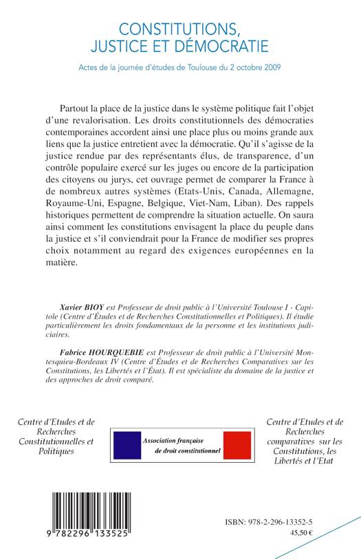Les droits constitutionnels des démocraties contemporaines accordent une place plus ou moins grande aux liens entre justice et démocratie. Qu'il s'agisse de la justice rendue par des représentants élus, de transparence, d'un contrôle populaire exercé sur les juges ou encore de la participation des citoyens ou jurys, cet ouvrage compare le système de la France à celui de nombreux autres pays. La question de la pertinence de modifications en France, notamment au regard des exigences européennes, est posée.