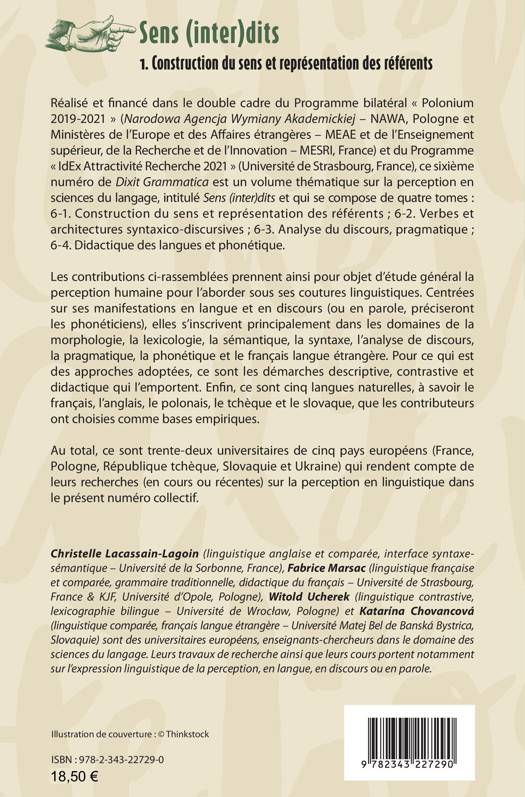 Les contributions ci-rassemblées prennent ainsi pour objet d’étude général la perception humaine pour l’aborder sous ses coutures linguistiques. Centrées sur ses manifestations en langue et en discours (ou en parole, préciseront les phonéticiens), elles s’inscrivent principalement dans les domaines de la morphologie, la lexicologie, la sémantique, la syntaxe, l’analyse de discours, la pragmatique, la phonétique et le français langue étrangère. Pour ce qui est des approches adoptées, ce sont les démarches descriptive, contrastive et didactique qui l’emportent. Enfin, ce sont cinq langues naturelles, à savoir le français, l’anglais, le polonais, le tchèque et le slovaque, que les contributeurs ont choisies comme bases empiriques. Réalisé et financé dans le double cadre du Programme bilatéral « Polonium 2019-2021 » et du Programme « IdEx Attractivité Recherche 2021» (Université de Strasbourg, France), ce sixième numéro de Dixit Grammatica est un volume thématique sur la perception en sciences du langage, intitulé Sens (inter)dits et qui se compose de quatre tomes : 6-1. Construction du sens et représentation des référents ; 6-2. Verbes et architectures syntaxico-discursives ; 6-3. Analyse du discours, pragmatique ; 6-4. Didactique des langues et phonétique.