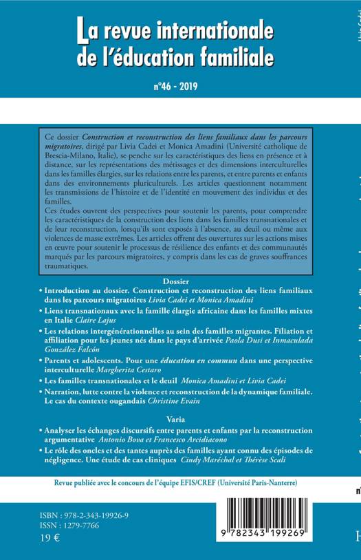 La perspective transnationale qui marque nombre de migrations nécessite d'examiner les approches développées par les personnes et les groupes familiaux pour maintenir les liens et assurer les responsabilités malgré les frontières et les distances. Ce dossier questionne notamment les transmissions de l'histoire et de l'identité en mouvement des individus et des familles. Les études ouvrent des perspectives pour soutenir les parents, pour comprendre les caractéristiques de la construction des liens dans les familles transnationales et de leur reconstruction, lorsqu'ils sont exposés à l'absence, au deuil ou même aux violences de masse extrêmes. Les articles offrent des ouvertures sur les actions mises en oeuvre pour soutenir le processus de résilience des enfants et des communautés.